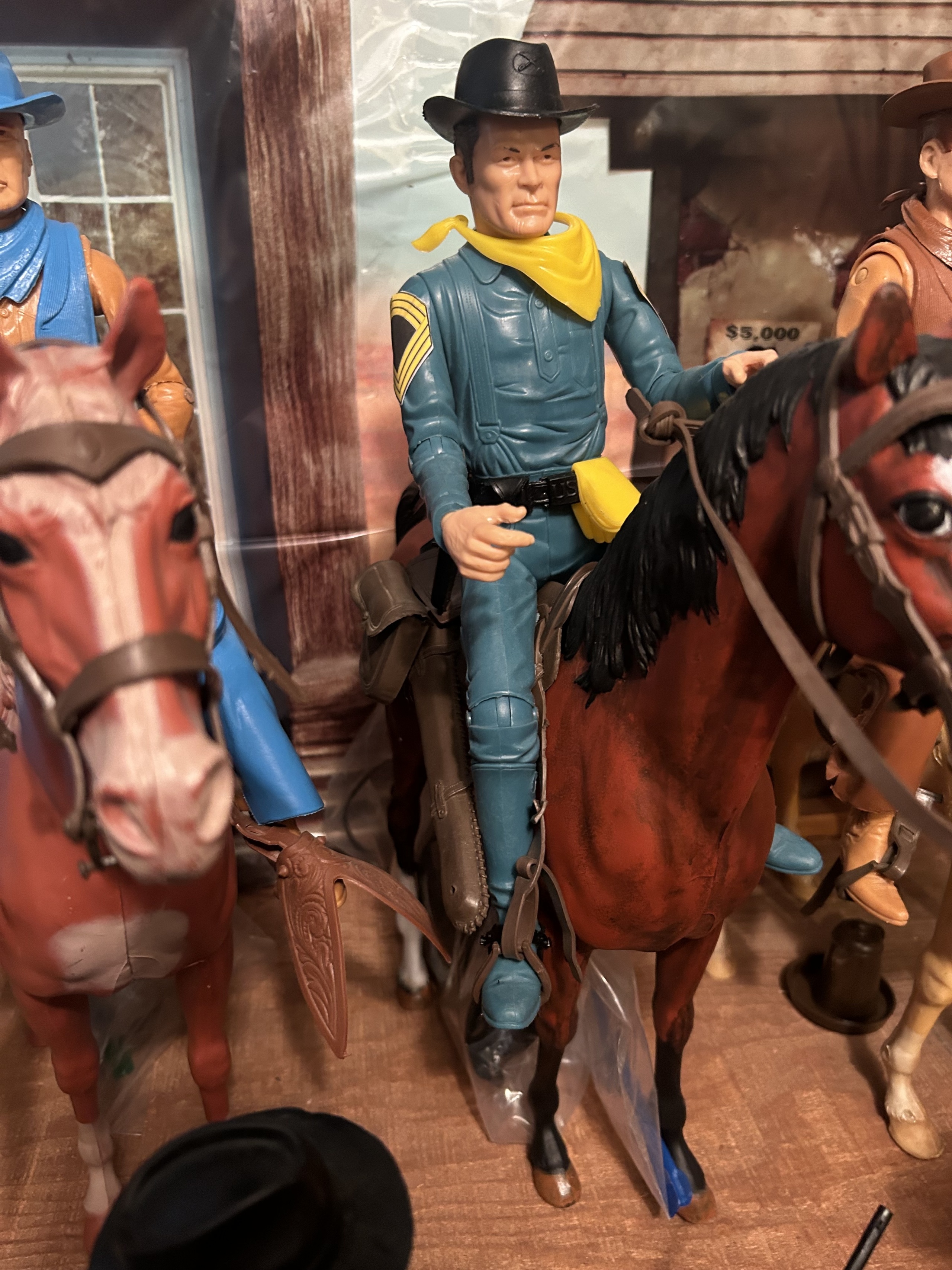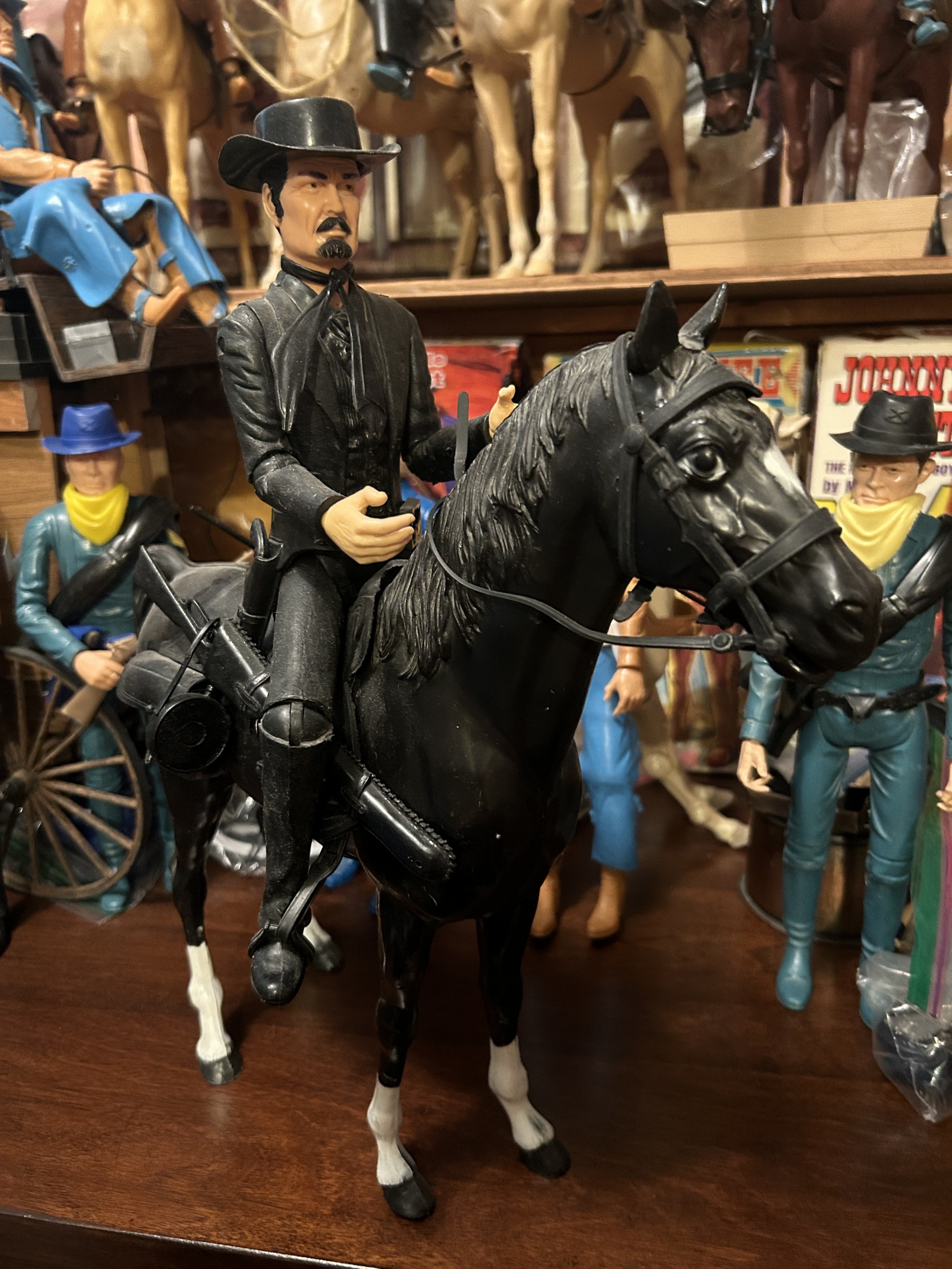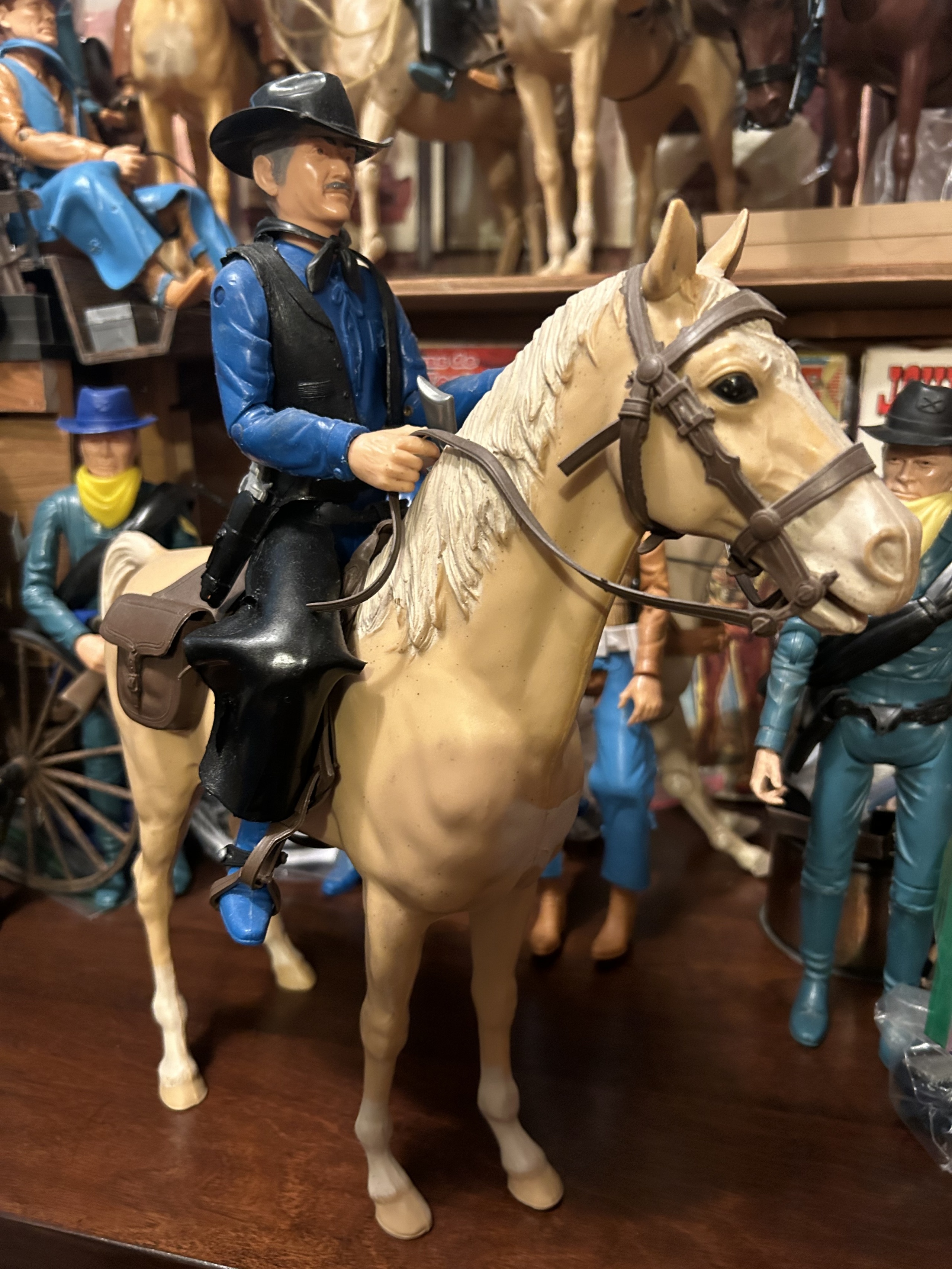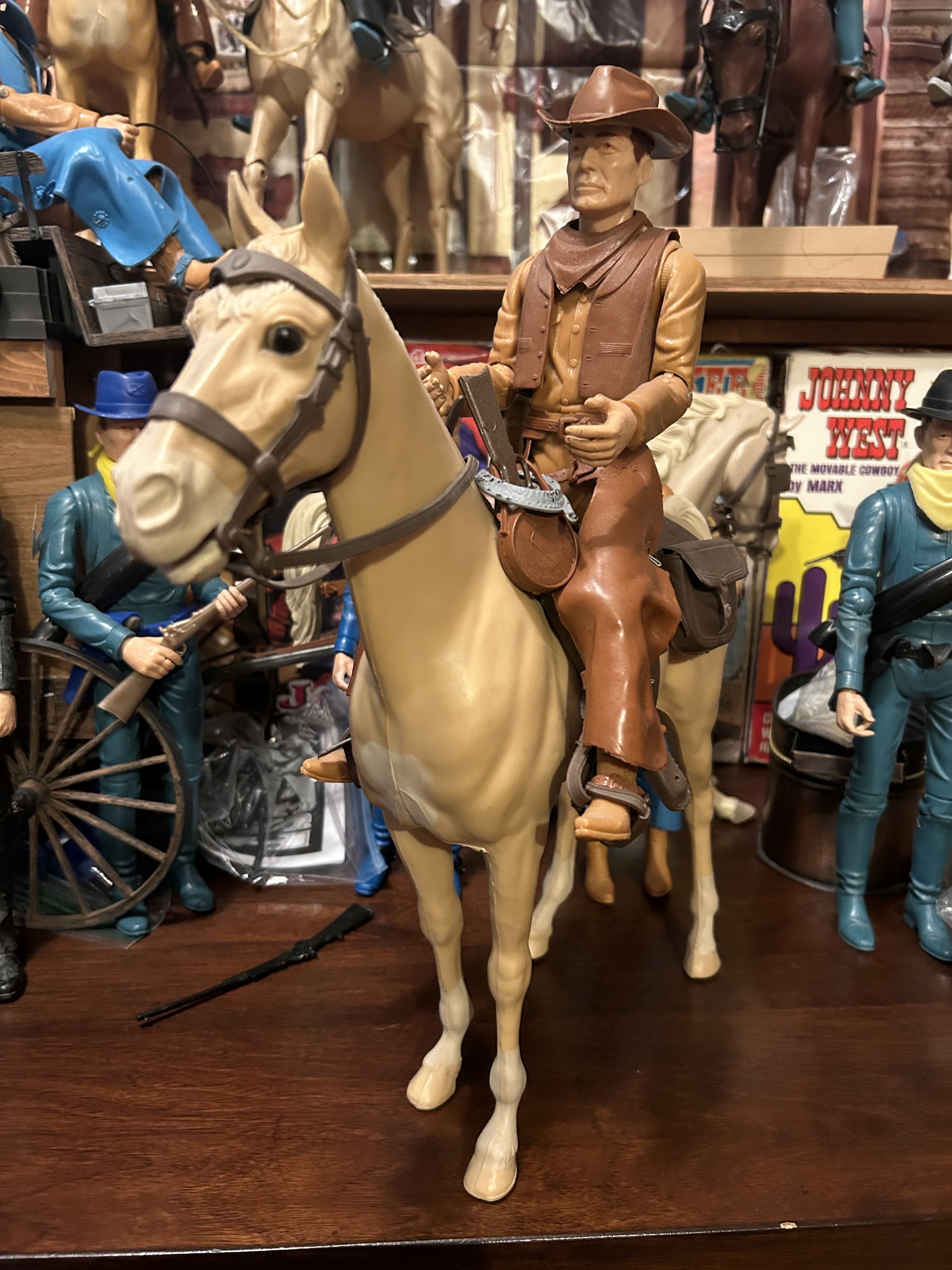 Johnny West figures all mounted on Thunderbolt horses: Johnny WestSheriff GarrettSheriff Goode CanadianSam Cobra on Satan horseGeneral CusterCaptain MaddoxZeb ZacheryChief Cherokee on Storm Cloud horseGeronimoFighting EagleAll figures come with all accessories and sheet, No boxes.