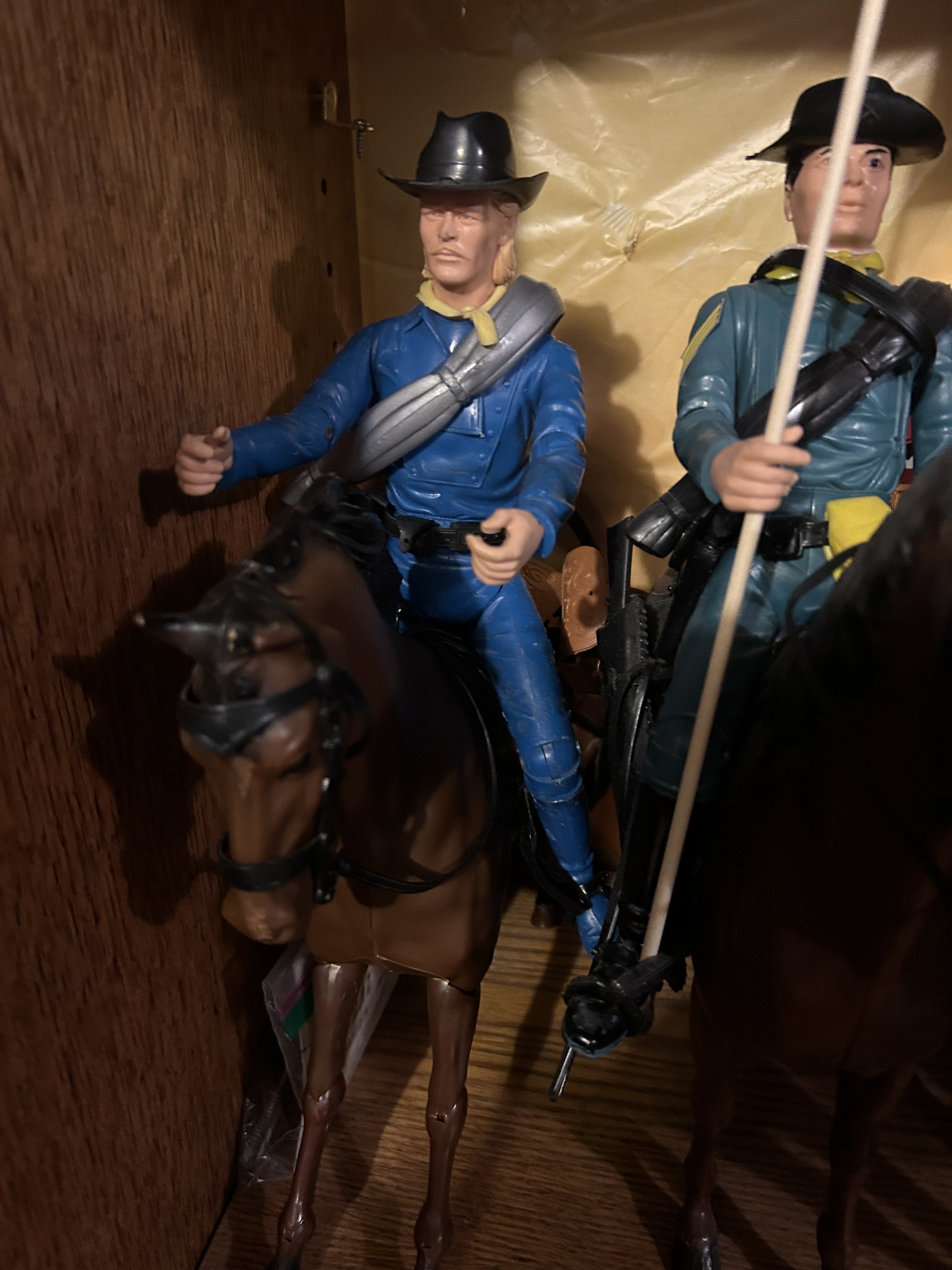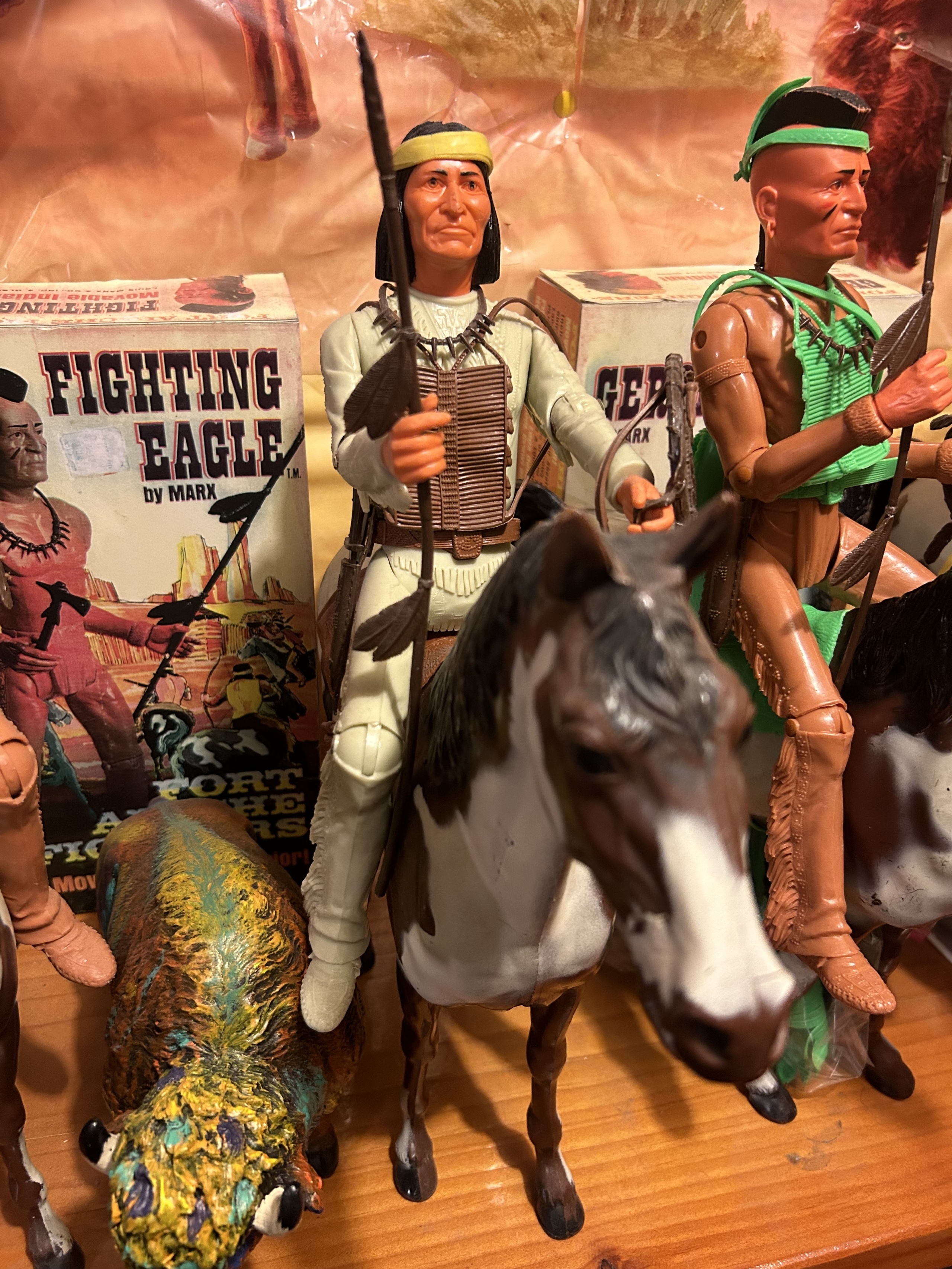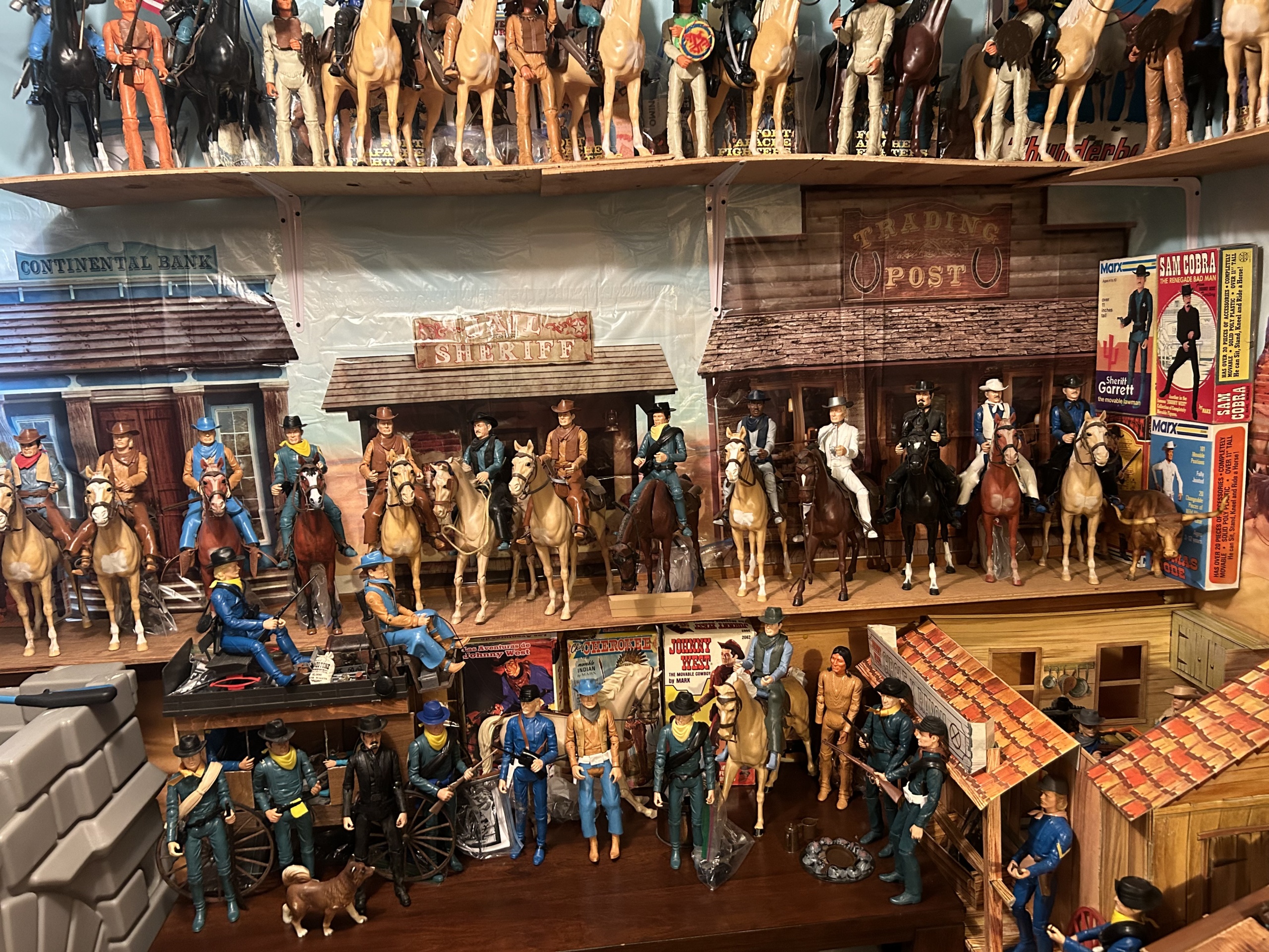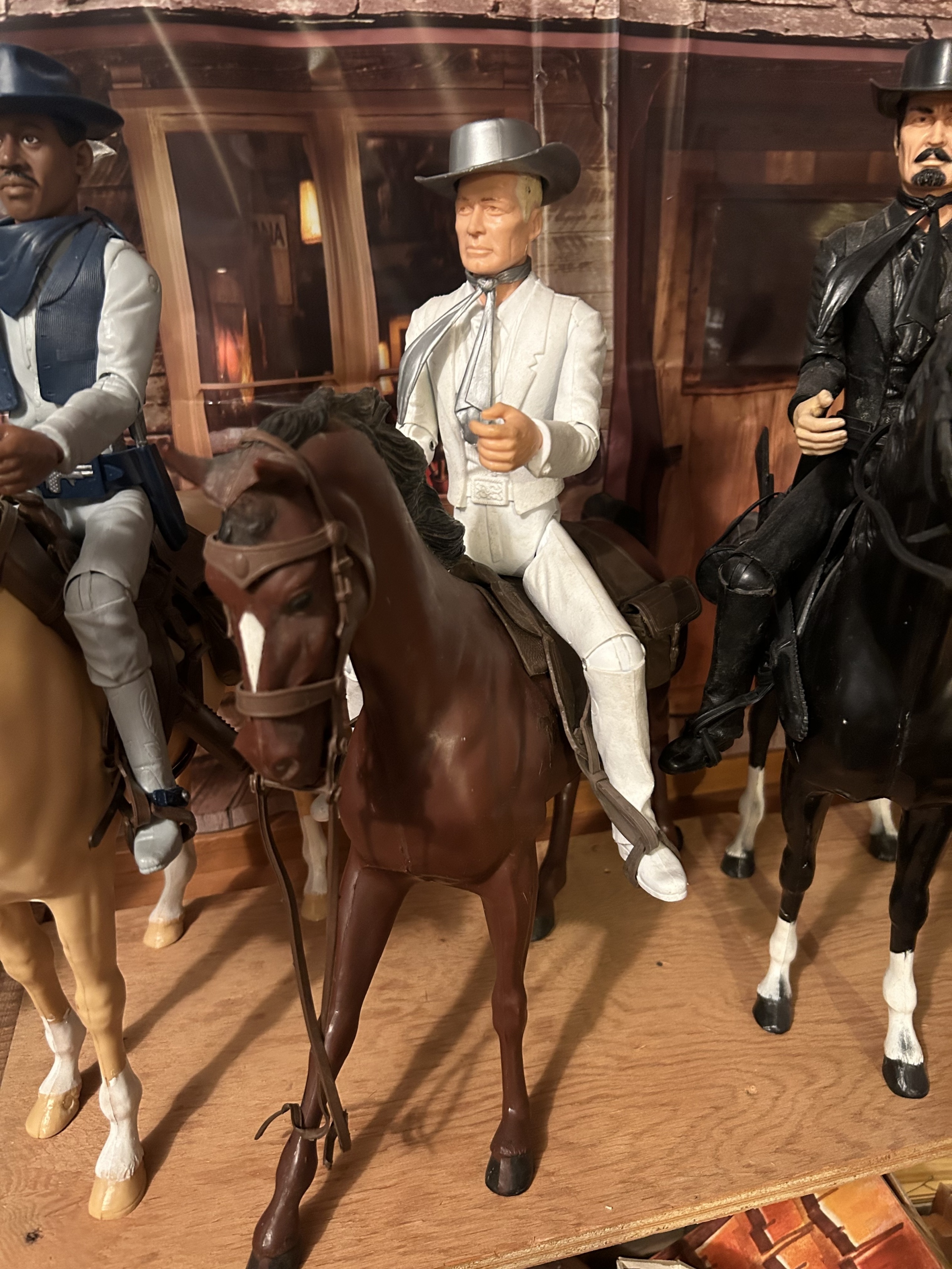 Johnny West figures all mounted on Thunderbolt horses: Johnny WestSheriff GarrettSheriff Goode CanadianSam Cobra on Satan horseGeneral CusterCaptain MaddoxZeb ZacheryChief Cherokee on Storm Cloud horseGeronimoFighting EagleAll figures come with all accessories and sheet, No boxes.